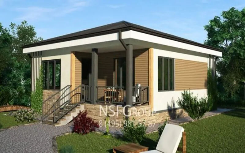 บ้านหลังนี้เป็นบ้านชั้นเดียว สไตล์โมเดิร์น หลังคาทรงปั้นหยา ปูด้วยกระเบื้องสีเข้ม ตัดกับผนังบ้านสีขาวที่ตกแต่งด้วยไม้ ให้บรรยากาศอบอุ่น เหมาะสำหรับการใช้เวลาร่วมกับคนในครอบครัว