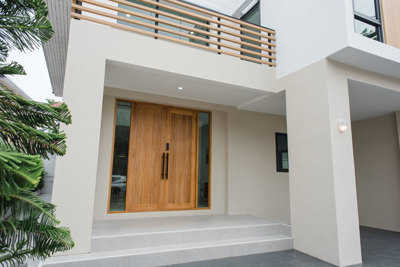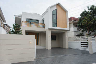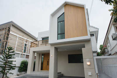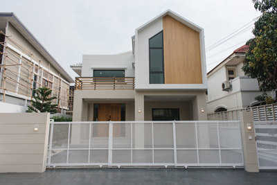 ลักษณะเป็นบ้านเดี่ยว 2 ชั้น โดดเด่นด้วยประตูรั้วสีขาวแบบโปร่ง ดูโมเดิร์น สามารถมองเห็นภายนอกได้ พร้อมกับรักษาความเป็นส่วนตัว ส่วนด้านข้างมีสวนหย่อมขนานไปกับแนวกำแพง พื้นที่สีเขียวเล็ก ๆ ที่ช่วยเพิ่มความสดชื่นให้กับบรรยากาศได้ไม่น้อย พร้อมที่จอดรถหน้าบ้าน 2 คัน สำหรับทางเข้า-ออกตัวบ้านตกแต่งด้วยประตูไม้บานพับ ให้กลิ่นอายความเป็นญี่ปุ่นตั้งแต่ก้าวแรก